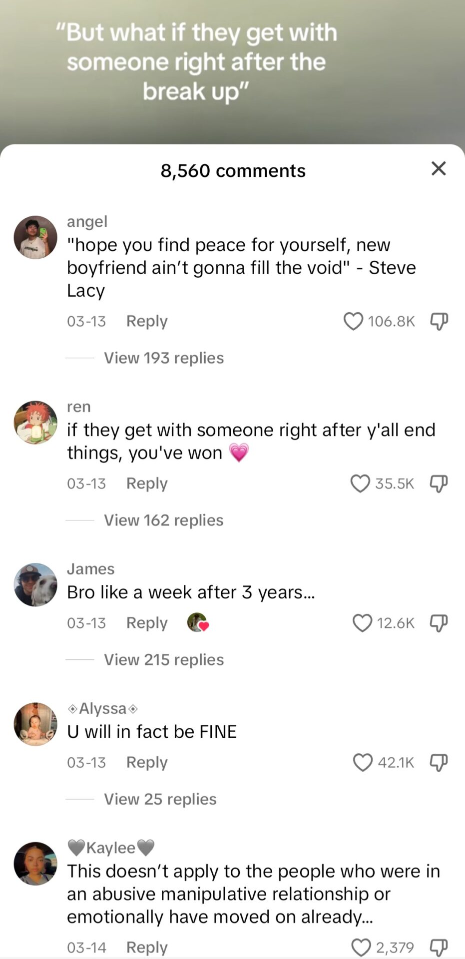 In the context of breakups, the conversation on this topic drew a greater teenage audience, or persons aged 14 to 25. Supporting evidence of this was the survey taken which shows about 70% of users who actively checked up on their ex-partners ranging between ages 18 to 29 (Vogels & Anderson, 2020). One example that showed common discussion around this topic was the recent trend of a song called End of Beginning by Djo. It was taken based on the lyrics saying “Just trust me, you’ll be fine” which, in the majority of instances, was the user going through a breakup and contrasted it with an encouragement to heal from such traumas and support others who are experiencing similar suffering.