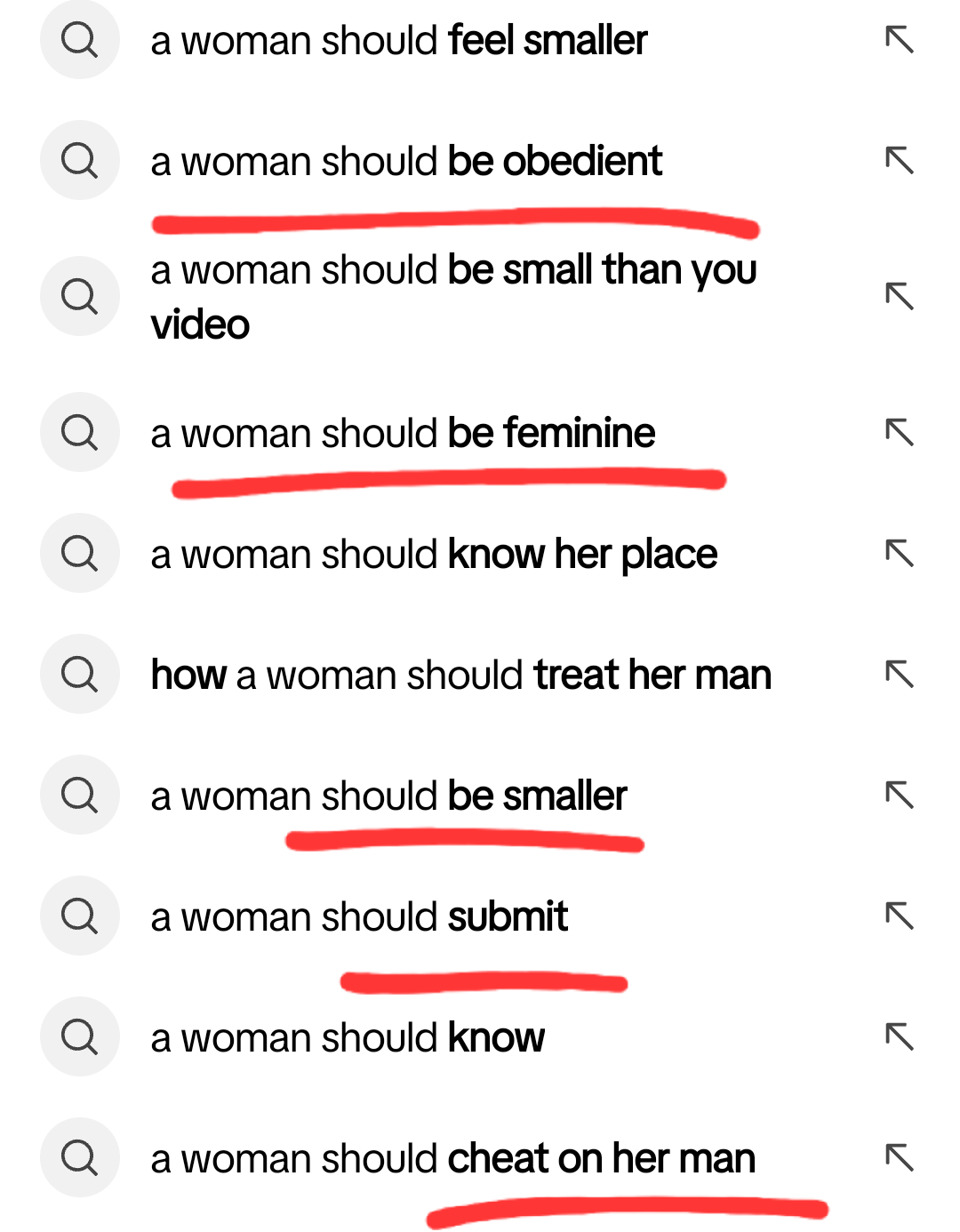I believe that a segment of this group has created an echo chamber of beliefs that often the male in the relationship should handle the relationship in the same way that other relationships are portrayed online; otherwise, they would be deemed not reaching the standards of the so-called ‘bare minimum’. Not only has this put strain on couples, but it has also made it harder for them to recognize that the outcomes are not determined by the experiences of outsiders. Common searches, as shown in the screenshot below, are assessments made by both genders towards each other in a relationship about what they “should do” to be a good partner.