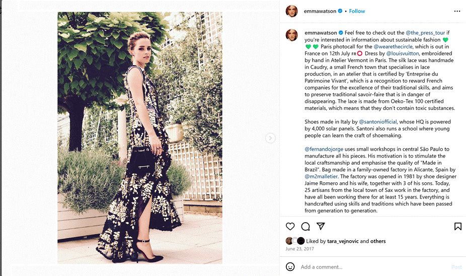 Figure 3- Watson, E. [@emmawatson]. (2017, June 23rd posted). Feel free to check out the @the_press_tour if you’re interested in information about sustainable fashion. [Instagram post]. https://www.instagram.com/p/BVqFbtMBgPa/?hl=en&img_index=1