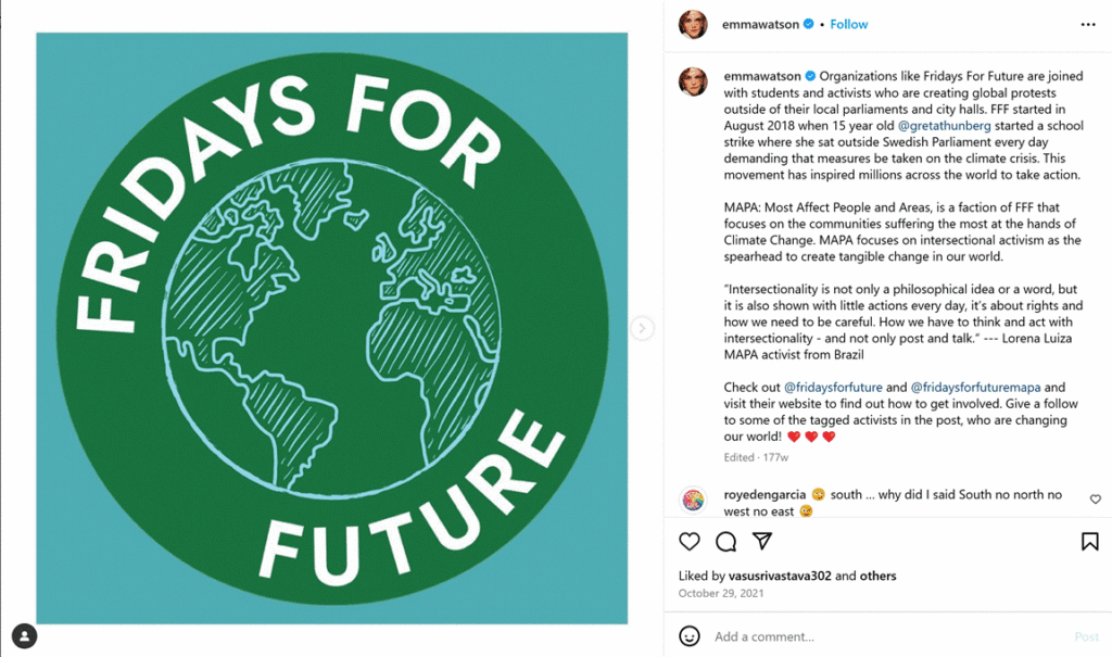 Figure 4. Watson, E. [@emmawatson]. (2021, October 29th posted) Fridays for Future. [Instagram post]. https://www.instagram.com/p/CVlTVZZvb8n/?hl=en&img_index=1