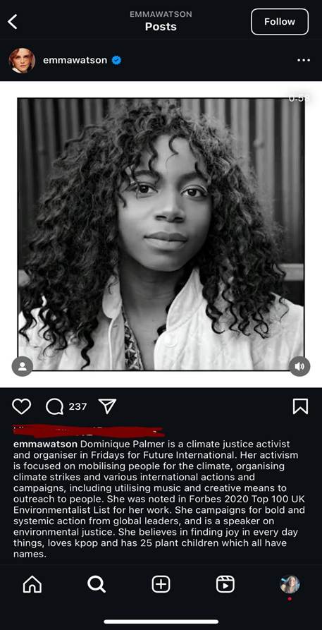Figure 2- Watson, E. [@emmawatson]. (2021, November 9th posted). Dominique Palmer is a climate justice activist and organiser in Fridays for Future International. [Instagram post]. https://www.instagram.com/p/CWDfVp3sA03/?hl=en
