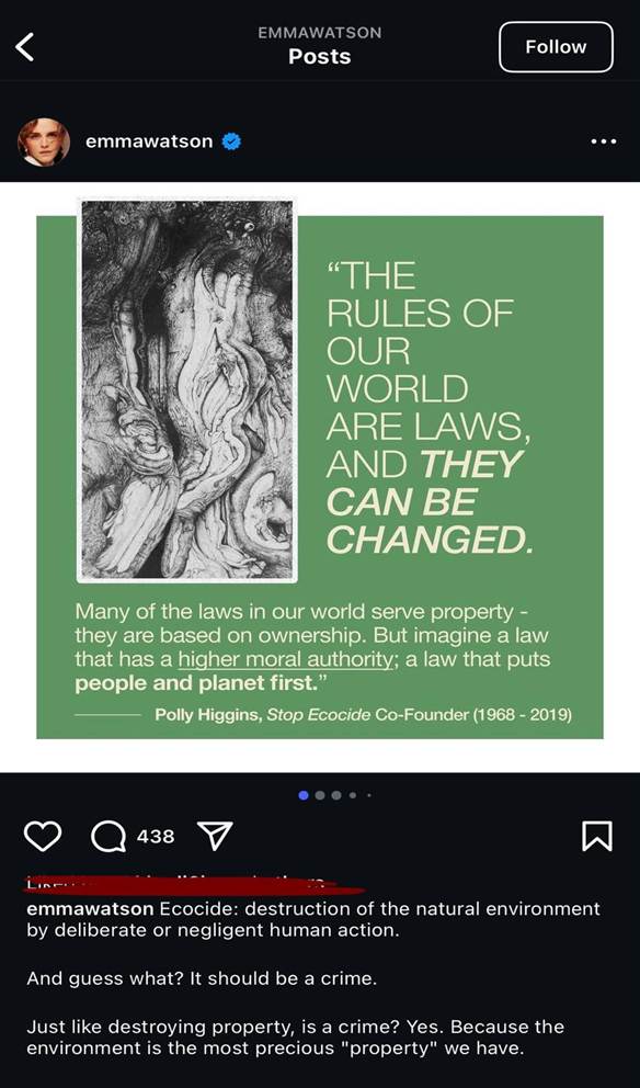 Emma Watson wins recognition as a British actress since her portrayal of Hermione Granger in Harry Potter films while additionally leading influential actions for gender equality and environmental sustainability. Through her role as a UN Women Goodwill Ambassador she uses her influential position to defend multiple social issues specifically concentrating on environmental protection work (Shende, 2024.) Through Instagram, Watson uses her substantial audience to emphasize the importance of environmental stability while posting content and stories about sustainable matters, climate change and the necessity of group effort. Watson shares environmental knowledge through Instagram, combined with informative posts about inspiring quotes that let users find methods to help environmental conservation. For example, as seen on Watsons Instagram profile, content such as Figure 1. Is a posted quote by Higgins about how instead of the law being served for people and their property, for the public to imagine a law that puts people and the planets wellbeing first. The quote encourages us to develop legal frameworks which place the health of people and planet at their center because environmental well-being directly shapes human success and justice.