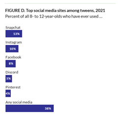 Figure 1: Top social media platforms used by U.S. tweens (ages 8-12) in 2021. (Source: Ridout, Peebles, Mann, & Robb, 2021, p.5)