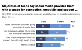 Figure 2: Percent of U.S. teens who say social media helps them feel more connected, creative and supported. Source: Pew Research Center (2022).